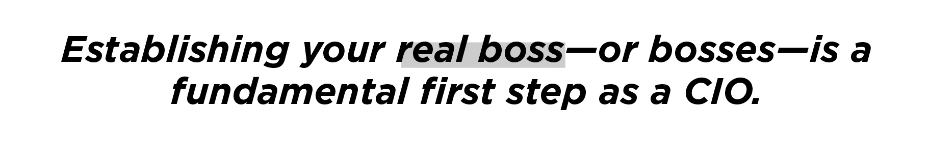 It’s not unusual that you need to satisfy your direct line manager and one or more other stakeholders in the organization. Of course, it makes your job easier if you have established that by satisfying your direct line manager, you’ll be satisfying the rest of the organization. Establishing your real boss—or bosses—is a fundamental first step as a CIO.