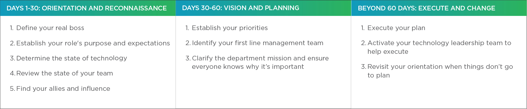 The road to achieving continual success as a CIO isn’t always easy or, at times, clear. It’s my hope that the steps I’ve outlined provide clear direction, enumerate key factors that impact your role, and make your first 60 days a positive foundation for the many more you’ll experience as a technology leader.